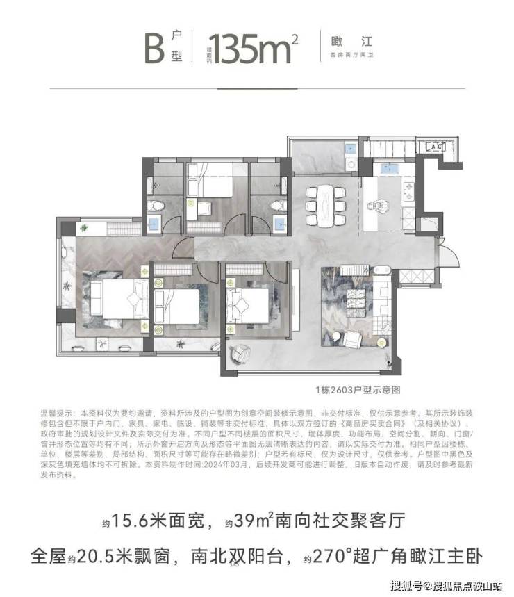 双主套设计,满足多代同堂需求;23 米环绕式飘窗,270° 环幕瞰江,主卧直面佛山水道。