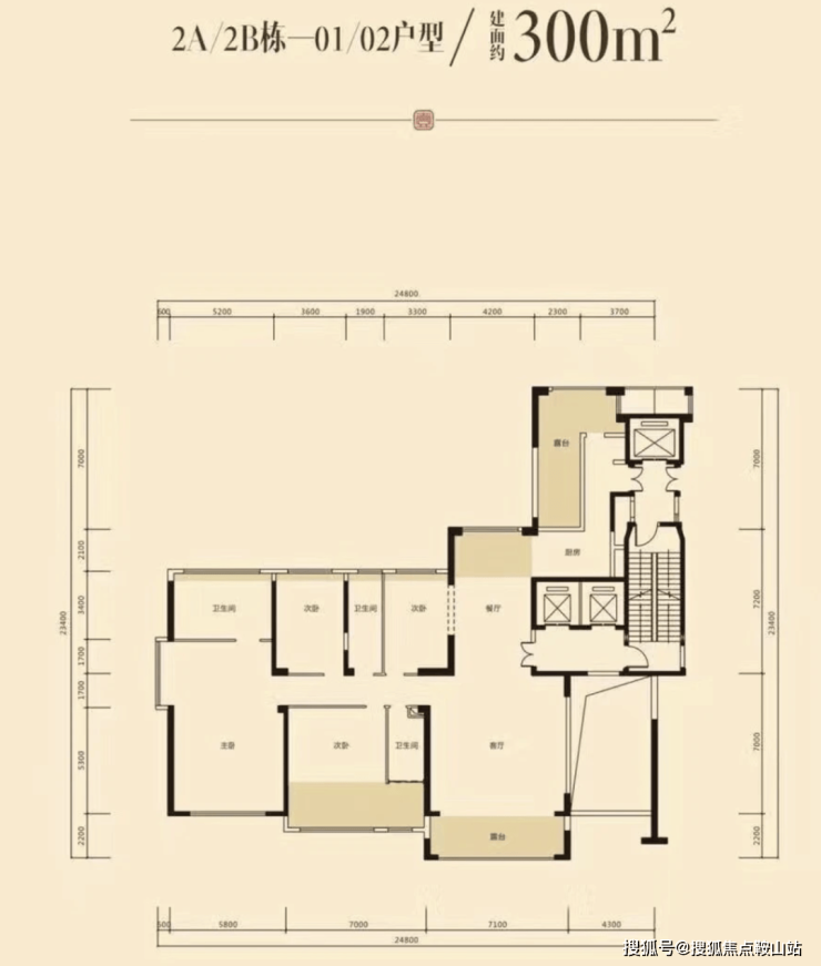 2、2A/B栋户型300平 4房2厅5卫 东南向