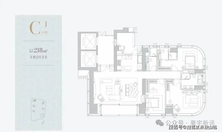 1C栋(1栋三单元)-51层:4梯3户,约210㎡,为一期的入门级户型,一层三户。