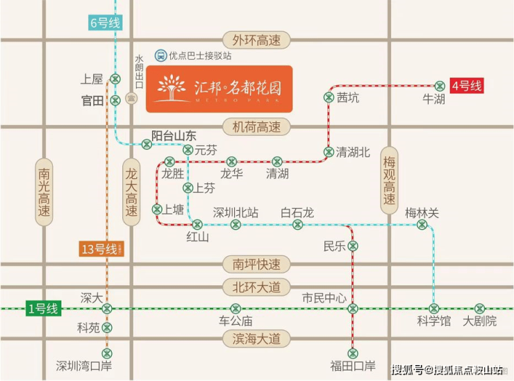 高效交通,链接全城 项目位于龙大高速水朗出口旁,邻近地铁6号线(已开通)及13号线(在建)。畅享龙大、南光、广深、机荷四大高速路网,社区接驳优点巴士,六条短线直达六大地铁站,三条快线直达大剧院/ 车公庙/ 科技园等中心区。