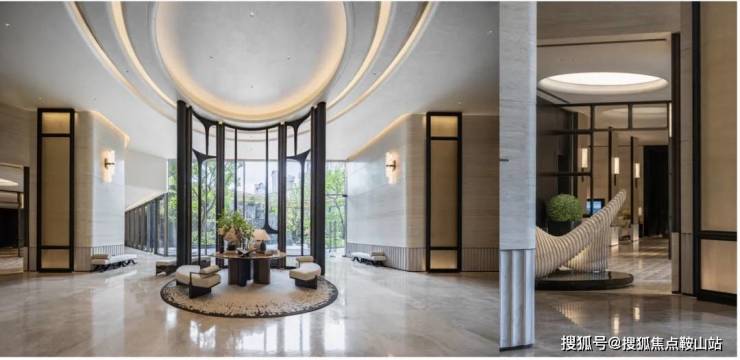 会所整体用材运用石材、木饰面、陶瓷等元素,还原材料本身的触感以及自然的舒适度,来打造东方典雅的空间。同时通过材质的延伸,呼应与建筑景观的一体性。
