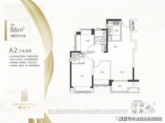 约86㎡3房1.5卫(1栋A座04/06户型、2栋03/05户型、3/4栋03/05/07户型)竖厅格局,餐客一体,动静分区结构,S型墙体预留冰箱位,创新型1.5卫设计,卫生间干湿分离设计,有东南、东北、西南朝向。