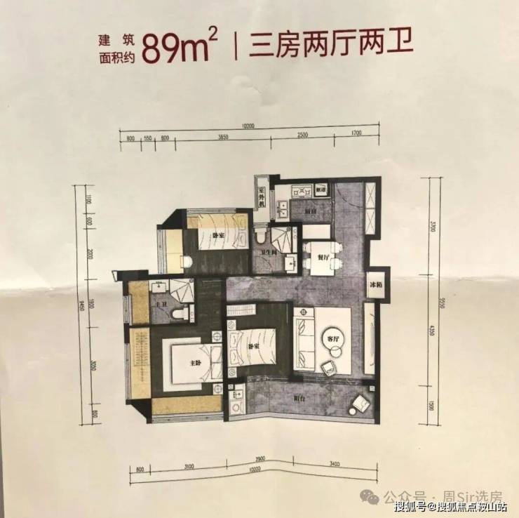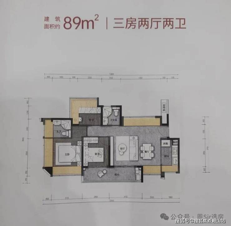 89㎡的3房2厅2卫,设计的是竖厅格局,客厅3.4米开间,LDKB一体化,S墙设计预留冰箱卡槽位,3个卧室分别做到了3.9米/2.9米/2.6米的宽度,客厅连接次卧出6.3米长的大阳台,L型厨房,卫生间干湿分离,有西北、西南或东南朝向。