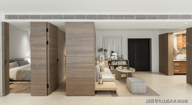 主力户型拥有约7.4m宽阔横厅,空间布局并不是常见的沙发面对电视墙,而是沙发直面落地窗外的景观。