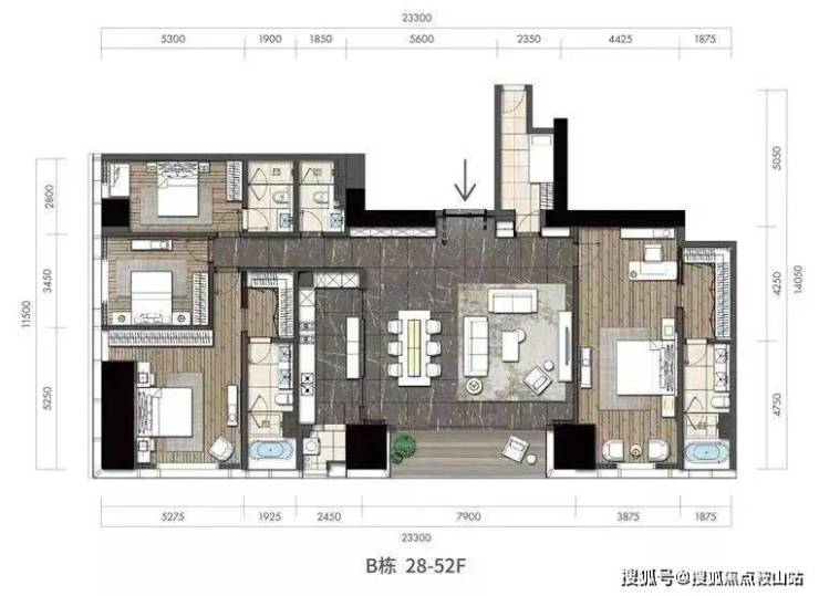 所有340㎡户型位于B栋28-52F正东朝向,23米观海面,向海而生,无言的霸气。