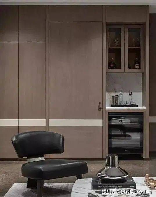 考虑到高楼层的非现实感,大面积运用了深木色进行装饰,借此传递出温暖踏实的家庭氛围。安静一隅的酒柜立体组合,五星级酒店般的三段式布局。