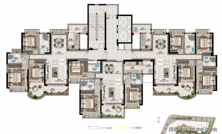 2栋为南北朝向,与3栋相连。 户型分别是 121/128/145㎡三至四房 ,其中01/02户型布局相似。