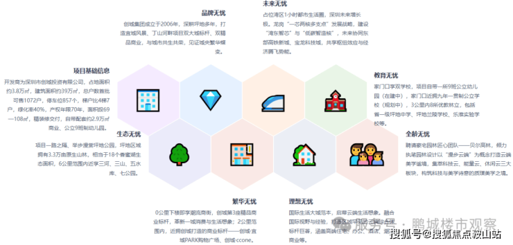 创城:云璞是深圳创城投资开发的精装住宅项目,位于龙岗坪地,占地3.8万m,建面39万㎡7,提供69-108m7二至四房,项目优势包括品牌实力、湾东枢纽区位、双地铁(3号线东延线、深惠城际)、教育资源(公立幼儿园及规划学校)、生态资源(公园及山水)、商业配套(2.9万㎡商业)、全龄化社区设计及国际品牌精装。周边有旧改红利及低碳域规划,定位为云端综合体,满足城市菁英家庭需求。