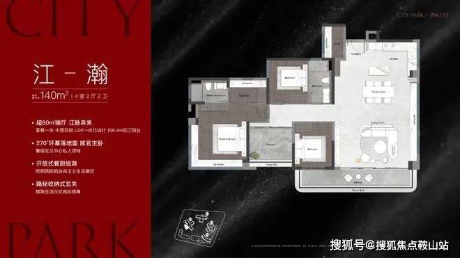 140㎡“鎏光/御潮”:西南/南向一线江景,双联阳台设计,LDK无界通透。