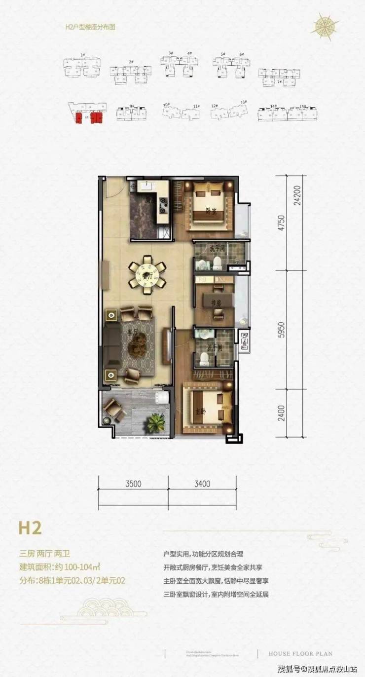 一单元两梯4户,二单元2梯3户,13层高,三房两厅两卫,超大2.4-2.75m阳台开间,双户型全朝南设计。