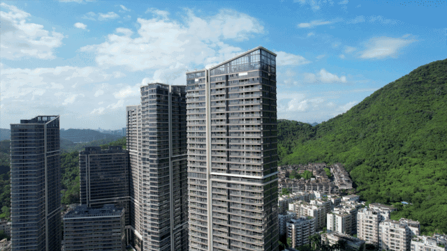 通过四栋高低错落的建筑天际线与高低起伏的梧桐山脊相呼应,让空间与山景结合,自然入室;青山远黛园景,窗窗见景。