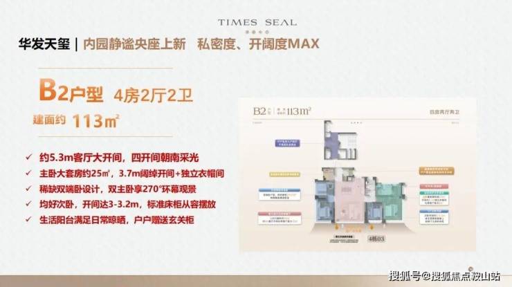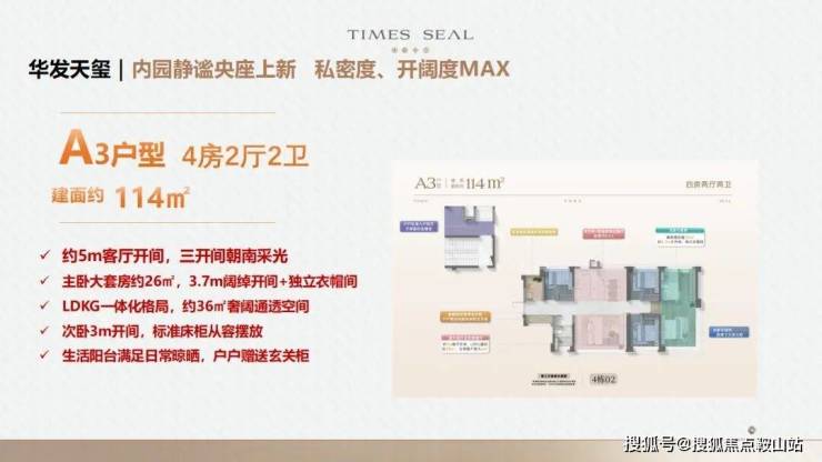 约110-114㎡四房两厅两卫:约16米通风面,户户是端户;约28㎡行政级端卧套房,270°景观视野,360°环统式采光