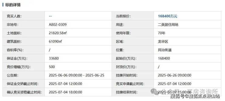 该地块土地用途为二类居住用地,土地面积21820.58㎡,建筑面积61090㎡,土地使用年限70年,按照“价高者得”的原则确定竞得人。