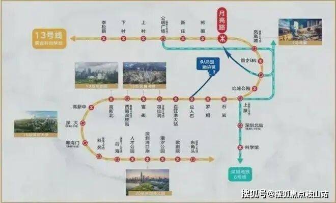 直线距离约400m到达地铁13号线月亮路站(建设中),1站凤凰城,9站到南山(约30分钟到达南山)。2025年将推动13号线二期(北延)建成通车(信息来源:宝安日报)。