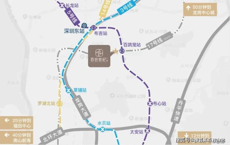 5/17号(规划中)百鸽笼站双地铁线上盖、1站换乘3/14号线、4站抵达福田芯,高效串联南山/前海、1站直达深圳东站,7站快速通达深圳北站