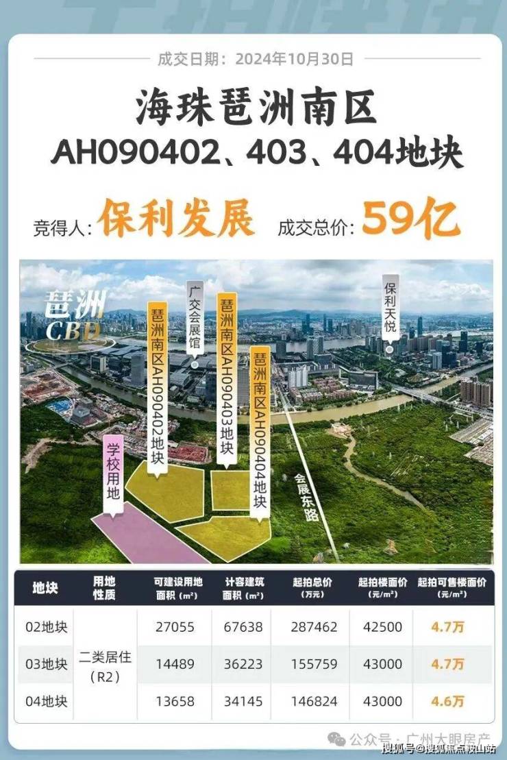 2024年10月30日,保利发展,付出了59亿+的总价,拿下了广州“压箱底”靓地——琶洲南三兄弟(AH090402号、03号、04号地块)。