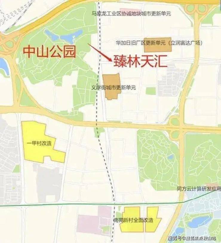 从旧改图则可以看出,项目所在区域,沿着南山大道两侧,分布着马家龙工业区协诚地块、华加日旧厂区、义学街、一甲村、南苑新村等城市更新项目。