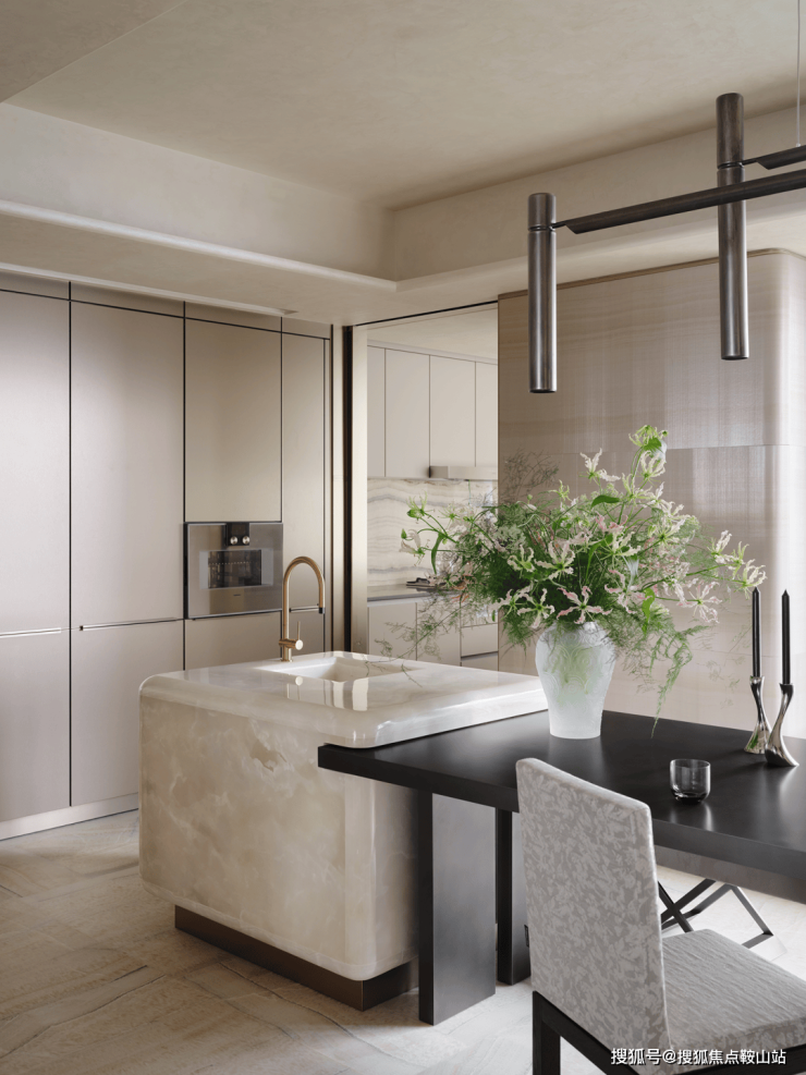 由餐厅踱步书房,动线开朗,纵深有度。柔韧纹理的透光玉石为空间增添温润的氛围,与端雅的青瓷器共同呈现现代和优雅的风格,给人宁谧的感觉。