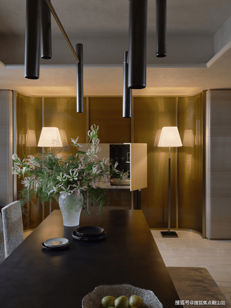 金属、织绣、石材具有不同属性,融合于室内空间的暧昧氛围中,悠扬回荡,和谐而优雅,温暖而关怀。