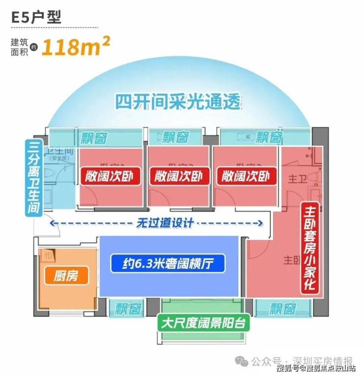 约100㎡的三房户型,三开间全部朝南,通风采光无死角,尽享阳光的宠溺。