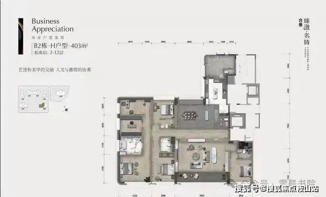 约 280 平四房格局非常规格,每个空间独立设计,对开发商的产品打磨能力有一定考验。建面322-403㎡南向大平层、头排江景