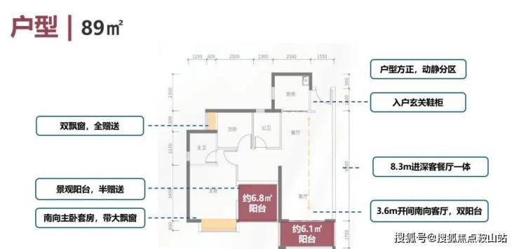 建面约89㎡的户型可以说是优质户型,客厅开间尺度和卧室尺度上做到了均衡,客厅开间约3.6米,主卧开间约3.3米,远超市面上同等面积的户型尺度。完全可以媲美一些超高层100㎡以上的户型尺度,进门看的第一感觉就是采光非常通透,视野开阔,看大雁山和石岩湖,格局也很方正。