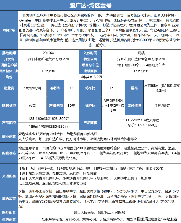 深圳鹏广达湾区壹号位于盐田新中心东海四街,由深圳市鹏广达集团有限公司开发。项目拥有海景景观、高端商业配套和便捷的交通网络。其设计现代,户型合理,居住环境优雅,是盐田区的优质楼盘,适合追求高品质生活的购房者。