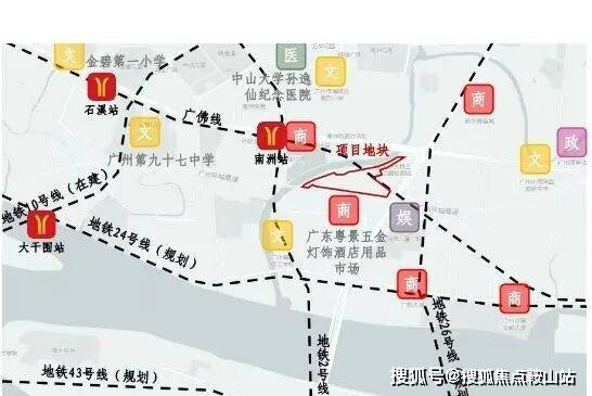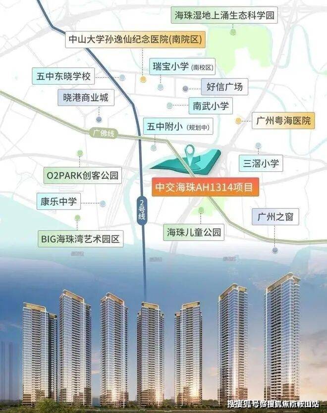 交通:位于海珠区三滘立交地块,紧邻南洲站(2号线与广佛线交汇站),距离约400-500米,广州绕城高速和广州大道在项目旁交汇。地铁2/广佛线南洲站、广州绕城高速、广州大道等,未来环岛路贯通将提升便利性。