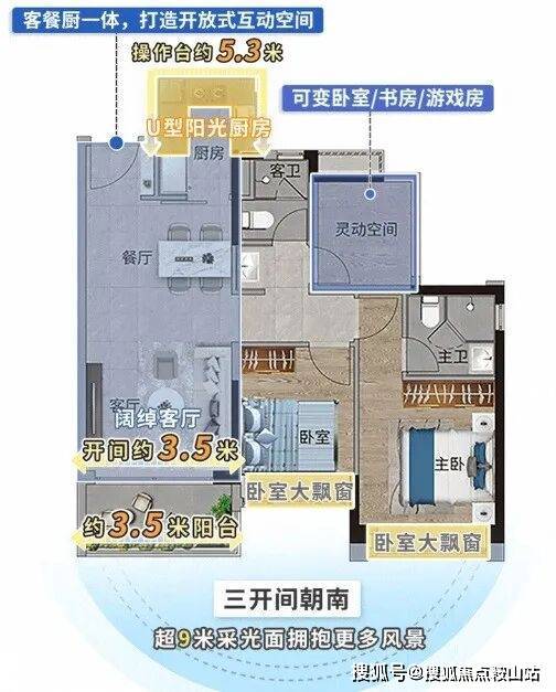 四开间朝南布局 ,拥有约12米 宽幅采光面, 客 餐厅一体联通南向宽幕阳台 , 延伸居家空间尺度,U型明厨设计动线流畅有序,星级主卧套房配置独立卫浴,更 预留灵动空间 ,延展生活所想,为兴趣与成长留白一方专属天地。