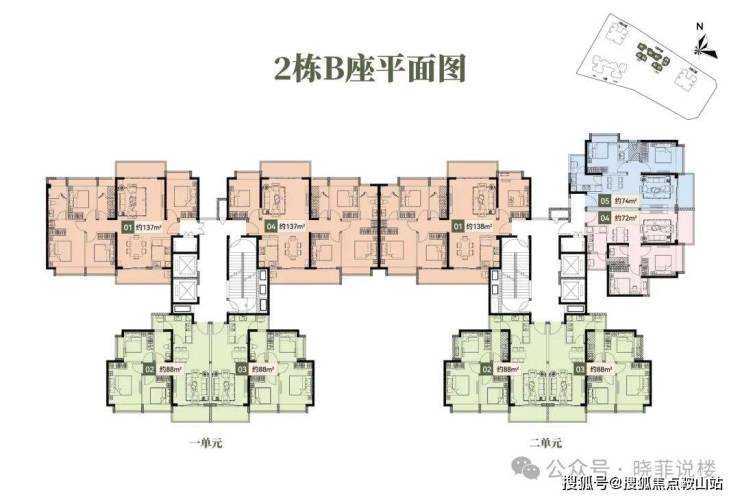 🔹2栋B座一单元01、04户型、2栋B座二单元01户型:面积约为137-138㎡的4房2厅2卫;
