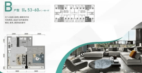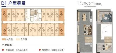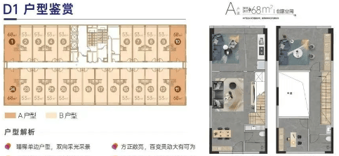 创意空间:面积范围从35-68㎡不等,实用率超过150%,适合投资或自住。