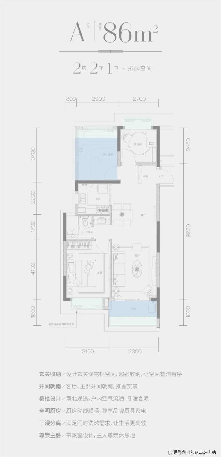 A戶型——建面約86㎡2房2廳1衛+拓展空間。