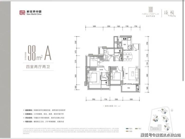98㎡的4房2厅2卫(AB户型),设计的是竖厅格局,客厅3.3米开间,LDKB一体化设计,动静分区,四开间朝南,分别做到了主卧15.23㎡/次卧8.8㎡/7.85㎡/次卧7.3㎡(包含墙体飘窗),U型厨房,卫生间干湿分离,同时带1个设备阳台约1.38㎡,阳台约5.28㎡西南或东南朝向。