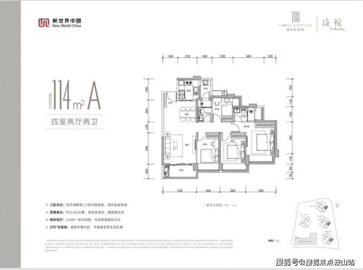 114㎡的4房2厅2卫,设计的是竖厅格局,客厅3.7米开间,LDKB一体化设计,动静分区,四开间朝南,分别做到了主卧17.34㎡/次卧12.68㎡/次卧11.35㎡/次卧7.42㎡(包含墙体飘窗),U型厨房,卫生间干湿分离,同时带1个阳台约3.79㎡+设备平台约1.2㎡,阳台约5.92㎡东南朝向。