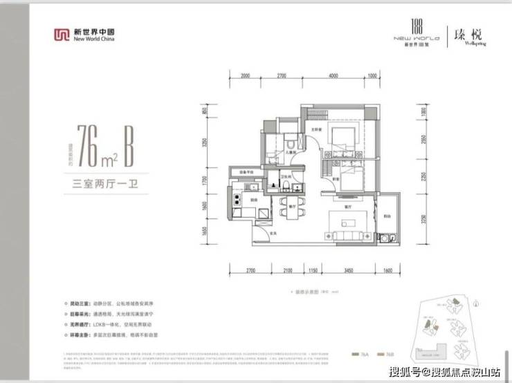 76㎡的3房2厅1卫,设计的是竖厅格局,客厅3.3米开间,LDKB一体化设计,动静分区,分别做到了主卧12.3㎡/次卧11.02㎡/次卧8.28㎡(包含墙体飘窗),U型厨房,卫生间干湿分离,同时带1个设备阳台约1.5㎡,阳台约5.28㎡东北、西北或东南朝向。