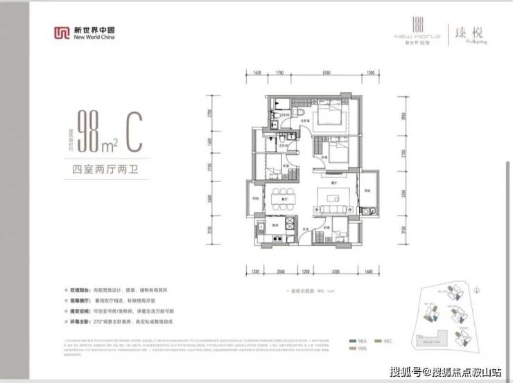 98㎡的4房2厅2卫(C户型),设计的是竖厅南北通透格局,客厅3.35米开间,客餐厅分离化设计,四开间朝南,分别做到了主卧15.7㎡/次卧11.2㎡/次卧7.85㎡/次卧7.42㎡(包含墙体飘窗),U型厨房,卫生间干湿分离,南北双阳台,大阳台约5.36㎡西南或东南朝向。