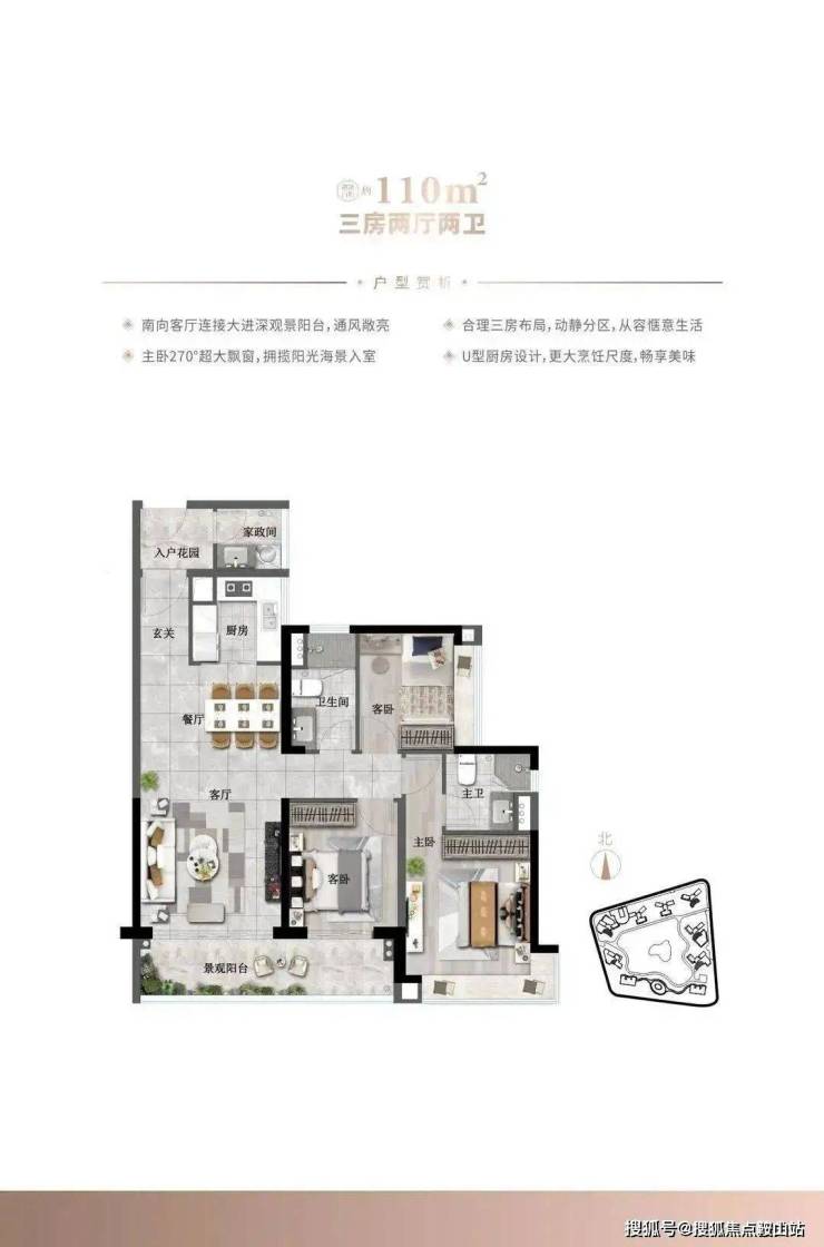 建面约110㎡三房两厅两卫户型