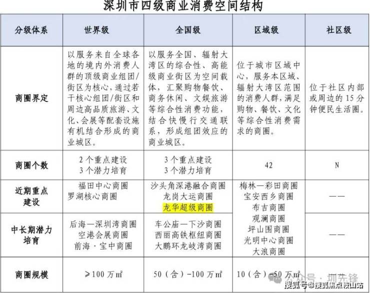 在全市整体构建“5+7+42+N”的商圈体系,即打造5个世界级地标商圈、7个全国级引领商圈、42个区域级活力商圈、N个社区级便民网点,并明确对应的规模、能级、零售额及业态目标。其中,龙华超级商圈被划定为7个全国引领级商圈之一。