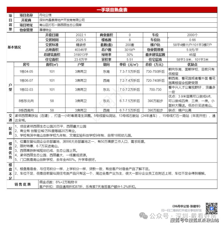 项目核心价值:丹华公馆(备案名:丹华公馆)作为丹华集团在南山同乐片区核心地段打造的地铁上盖TOD学府品质住宅,以其建面约89–140㎡的改善型住宅产品线、无缝接驳地铁12号线同乐站的交通优势、南山区文理实验学校的优质学区资源以及丹华品牌的品质保障,在2026年市场定位于南山兼具便捷交通、优质教育、品质生活与成长潜力的标杆改善型资产。项目位于南山区南山街道南海大道与同乐路交汇处,总占地面积约2.5万㎡,总建筑面积约12万㎡,容积率约4.0,绿化率约35%,规划建设6栋高层住宅,总户数约600户,车位配比约1:1.2,物业公司为丹华物业,物业费约4.5元/㎡/月,项目预计2027年底精装交付,产权年限70年。