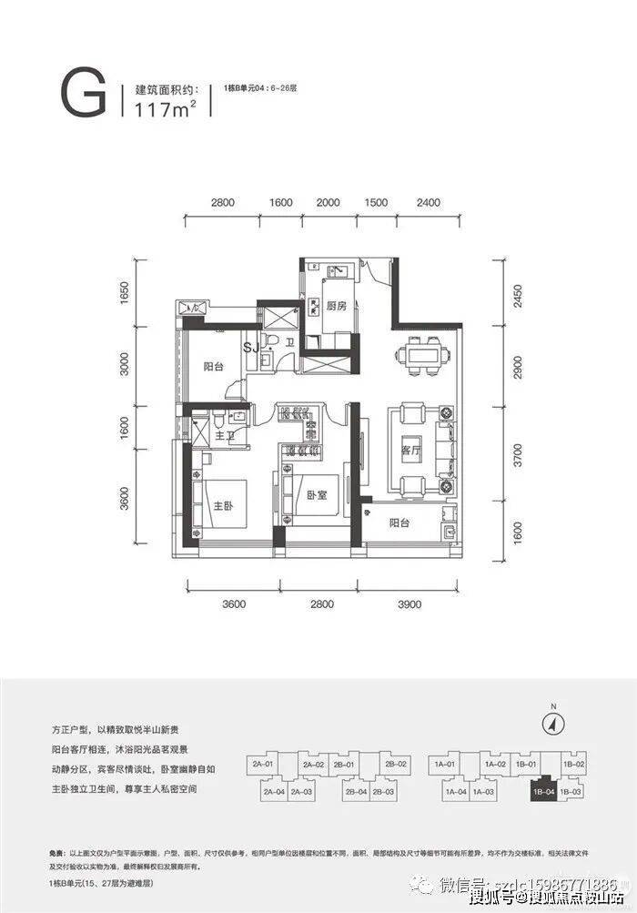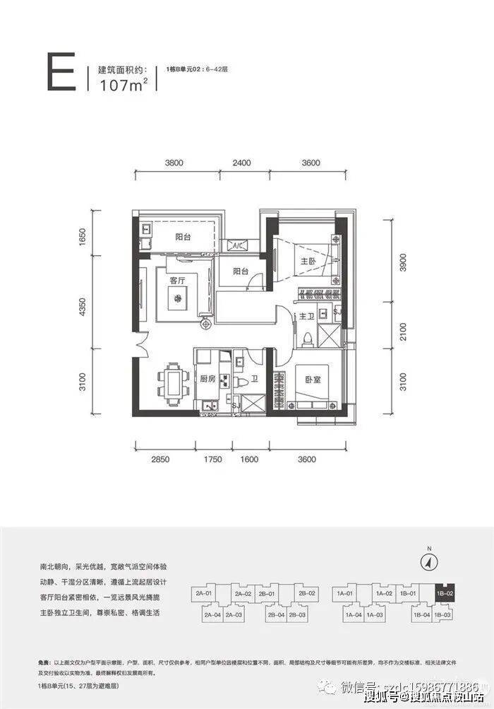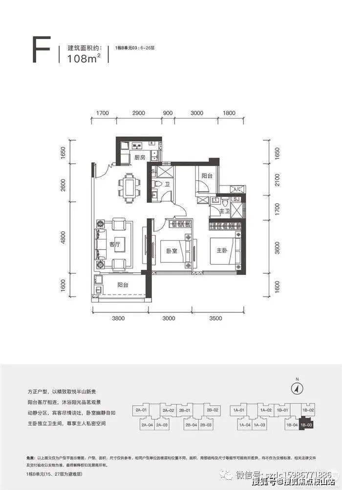 朝北向偏西,动静分区布局。户型方正空间布局科学合理。客厅开间3.8米带有1.65米进深景观阳台。主次卧方正居住空间较为舒适。相对108㎡F户型来说不用担心景观遮挡的问题。