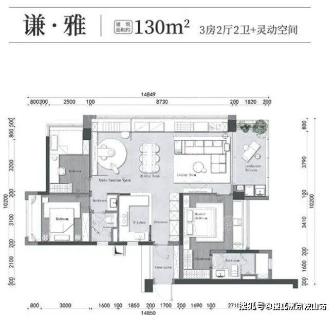 130平三房两厅两卫户型,东朝向,主卧跟次卧分别在东西两个方向。
