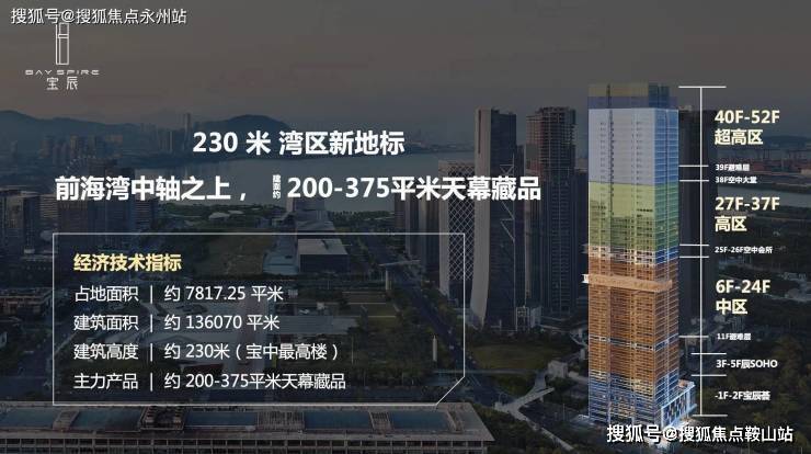 项目总高230米,为宝中最高楼,项目52层,分为中区、高区、超高区,6层起卖,11、39F为避难层,25-26F为空中会所,28F为空中大堂。除了空中大堂项目还有地下入库大堂+首层大堂,一共三重大堂。