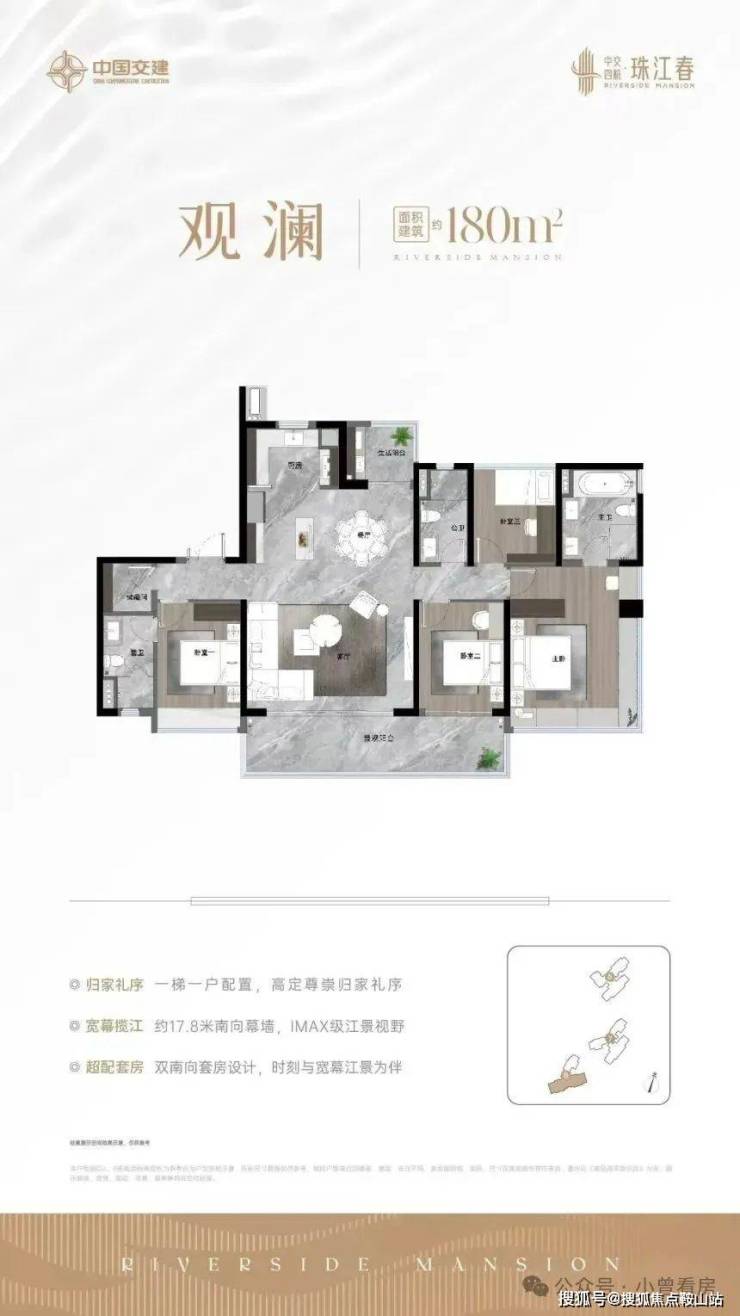 180㎡大户型更适合三代同堂,一梯一户私密性强,74㎡的横厅连通南北双阳台,北边看珠江波光,南边望小区园林,早上在 270° 飘窗边喝杯咖啡,这样的生活场景挺打动人。