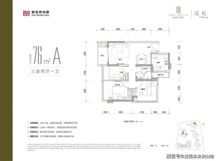 76㎡三房一卫:经典竖厅格局,客厅3.3米开间,LDKB一体化设计,动静分区。U型厨房,卫生间干湿分离,带1个设备阳台约1.5㎡,阳台约5.28㎡。套内约68.6㎡,得房率约90.3%(含赠送),76㎡能做成正规三房,确实有点东西。东北、西北或东南朝向,共90套。