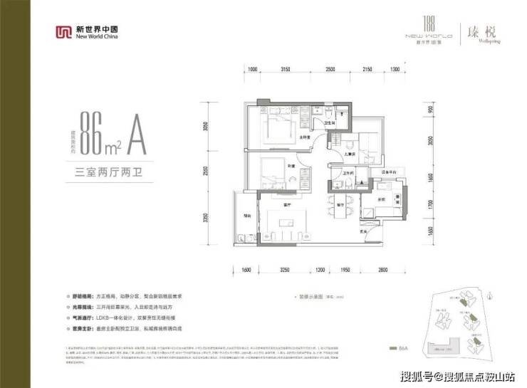 86㎡三房两卫:竖厅格局,客厅3.35米开间,LDKB一体化设计,动静分区。U型厨房,卫生间干湿分离,带设备阳台约1.3㎡,阳台约5.36㎡。东北或东南朝向,共90套。