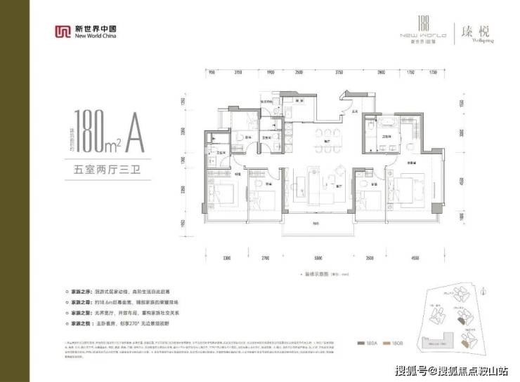 180㎡五房三卫:这是楼王户型,竖厅双龙抱珠格局,客厅5.5米开间,LDKB一体化设计,五开间朝南,约18.6米巨幕面宽。双主卧套间设计,主卧达到30.5㎡,非常奢适。U型厨房,公卫带生活阳台约3.89㎡,阳台约10.73㎡。西南朝向,少量稀缺房源。
