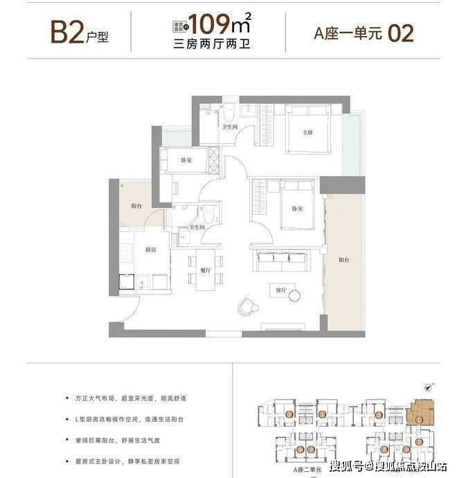 设计的是竖厅格局,客餐厅一体化,客厅连接次卧巨幕阳台,L型厨房,带1个生活阳台,主卧东南向,客厅阳台东北朝向。
