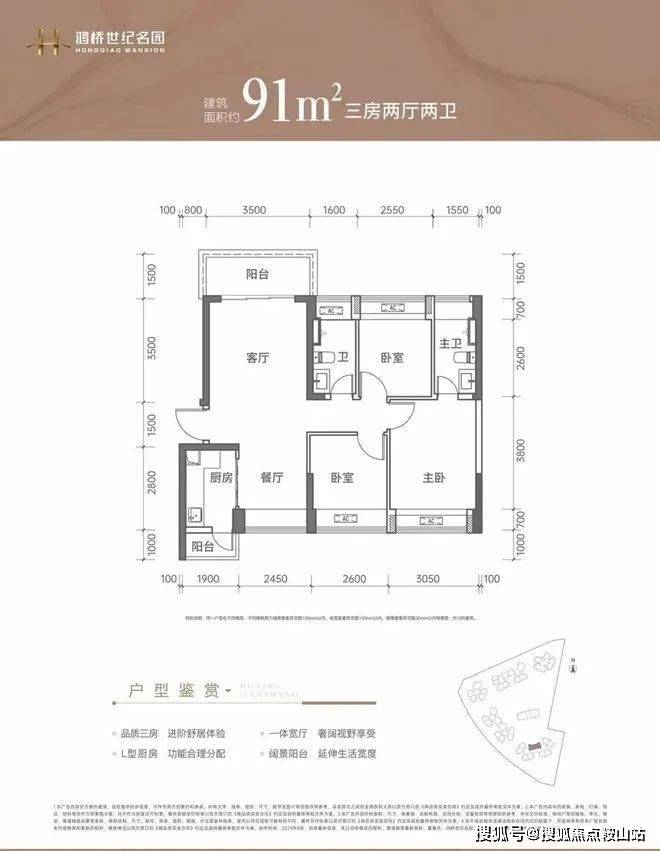 91㎡的3房2厅2卫:竖厅南北通透格局,客厅3.5米开间,LDKB一体化设计,3个卧室分别做到了3.05米/2.6米/2.55米的宽度,L型厨房带1个小生活阳台,卫生间干湿分离,阳台主朝正北向。✨✨鸿桥世纪名园开发商电话:400-859-7606【售楼处已认证】✨✽✽✽✽