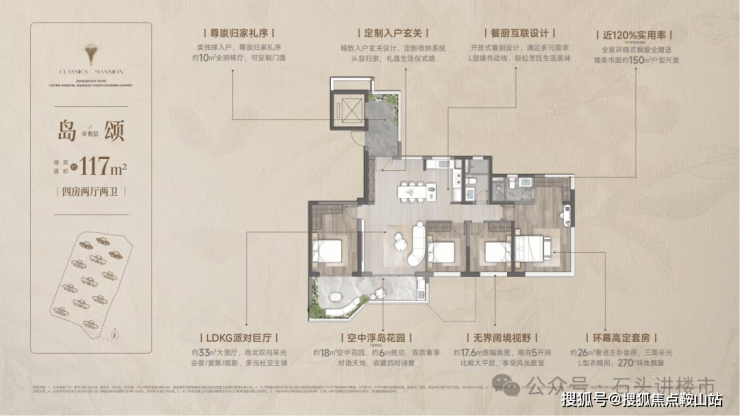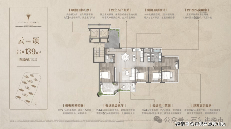 四代洋房·奢享写意人生 |双入户大堂、一梯一户,稀缺130%实用率(不含电梯厅),6面朝南,270°环幕采光,定制约6m错层空中浮岛,奢享墅质生活