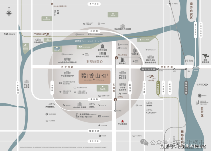•交通枢纽| 3纵2横1地铁、双城轨外联内通,直达广州,约400m(直线距离)即达岐江城地铁站 (在建中),近距中山站、中山北站两大站点